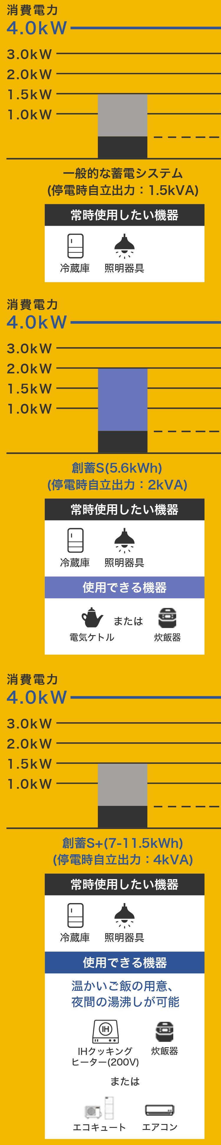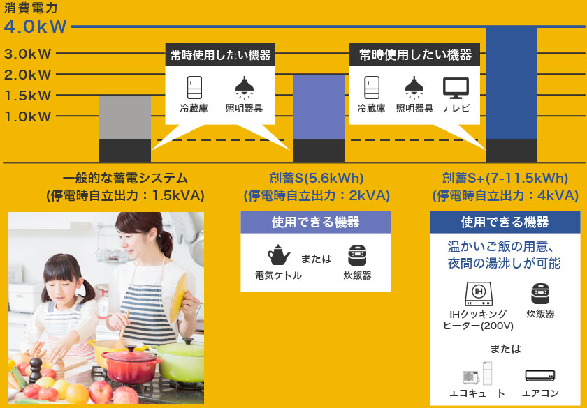 さらに、創蓄S+(7~11.2kWh)なら、停電時にエコキュート、IHクッキングヒーターまで使えます。※1 ※2